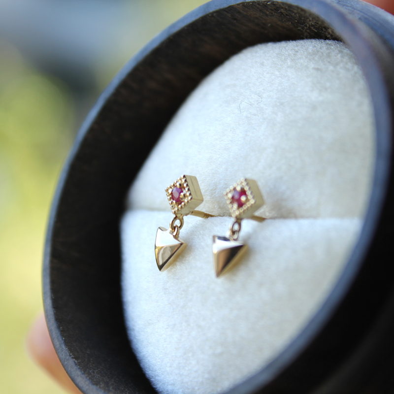 Yellow Gold Geometric Dangle Earrings with Ruby