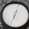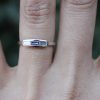 Handmade new, unworn minimalist 18k white gold ring set with a baguette cut natural fancy grayish blue diamond (.13cts) and 2 tapered baguette white diamonds (.12ctw).