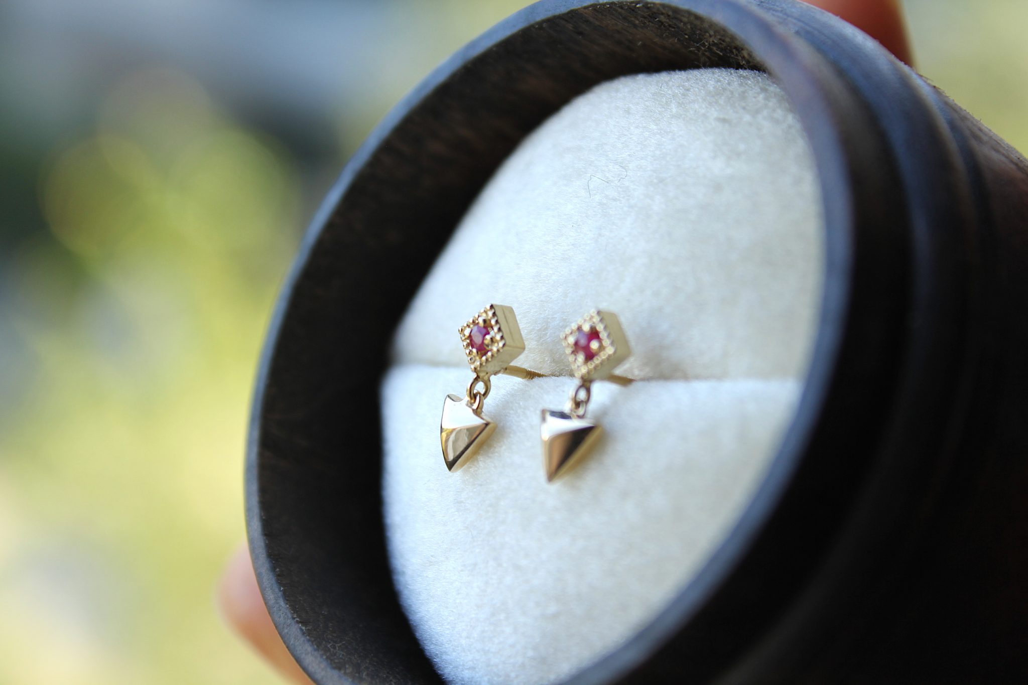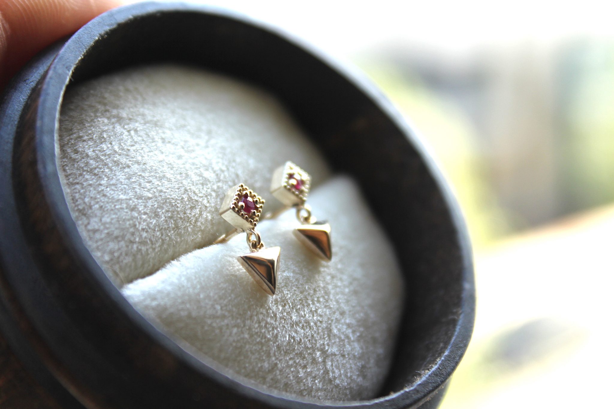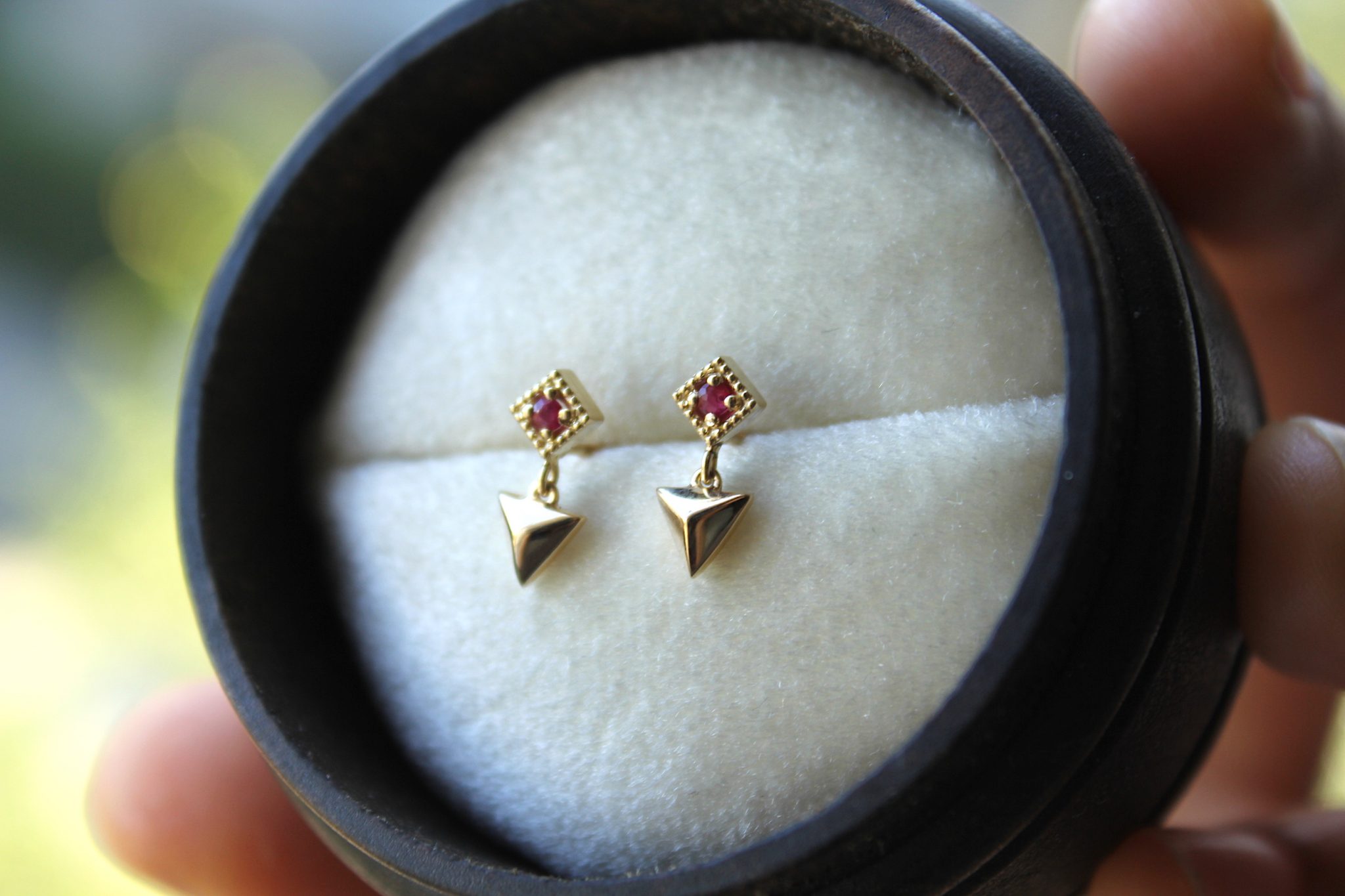 Yellow Gold Geometric Dangle Earrings with Ruby